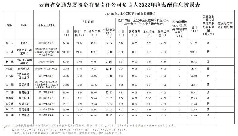 云南省交通發(fā)展投資有限責(zé)任公司負(fù)責(zé)人2022年度薪酬信息披露表