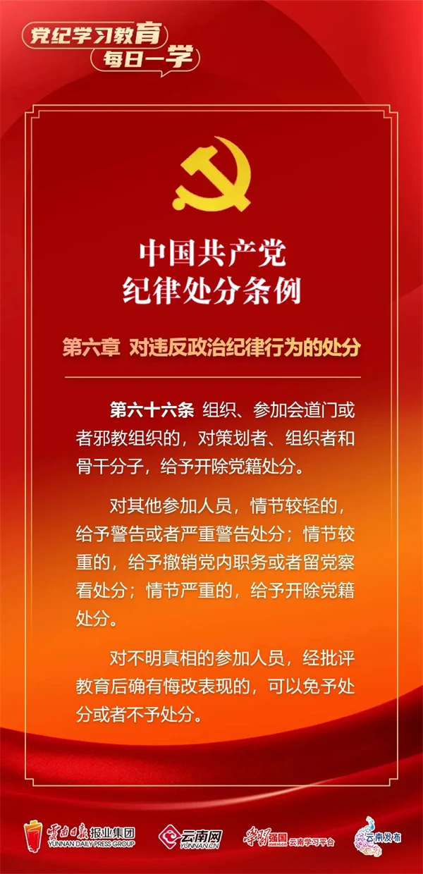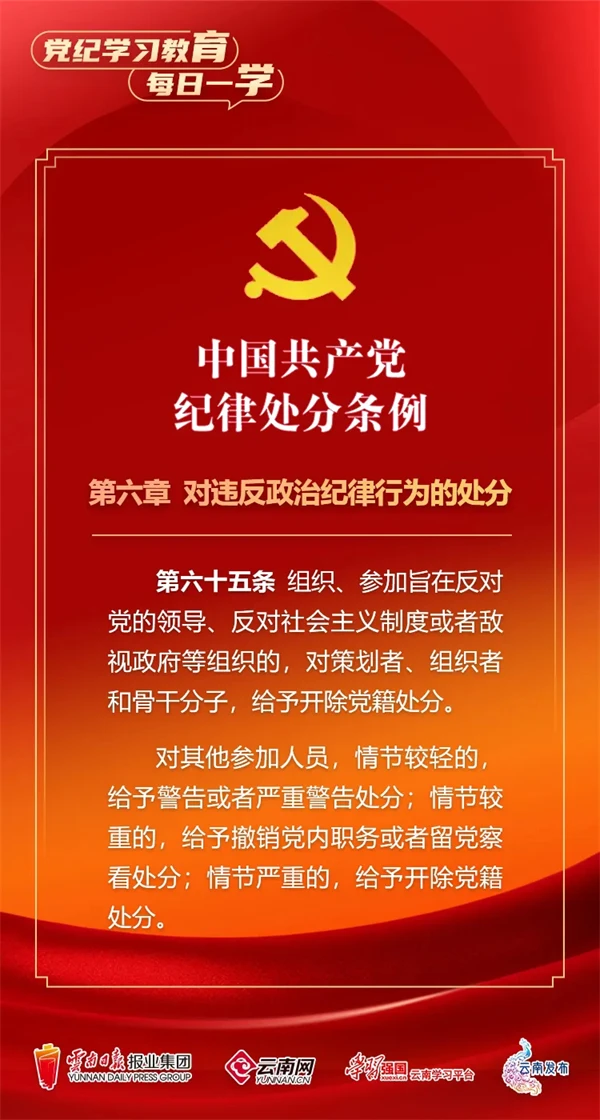 為深入學習貫徹落實習近平總書記關于黨紀學習教育的重要講話和重要指示精神,便于全省各級黨組織和廣大黨員、干部深入學習貫徹修訂后的《中國共產黨紀律處分條例》,云南網聯合“學習強國”云南學習平臺、云南發(fā)布共同策劃推出“黨紀學習教育·每日一學”專欄,營造全員參與、人人學紀的濃厚氛圍。今天,我們推出第?期,一起來學習。