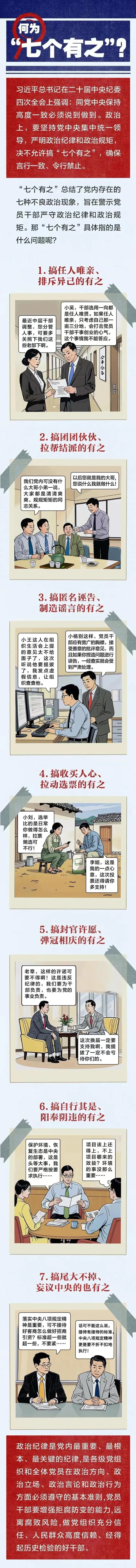 “七個(gè)有之”,是習(xí)近平總書記指出的無視政治紀(jì)律和政治規(guī)矩的一些突出問題,是從無數(shù)案例中抽象和總結(jié)出來的,具有極強(qiáng)的現(xiàn)實(shí)針對(duì)性。2021年11月11日,中國共產(chǎn)黨第十九屆中央委員會(huì)第六次全體會(huì)議通過的《中共中央關(guān)于黨的百年奮斗重大成就和歷史經(jīng)驗(yàn)的決議》,在第四部分“開創(chuàng)中國特色社會(huì)主義新時(shí)代”中,再次提到了“七個(gè)有之”。習(xí)近平總書記在二十屆中央紀(jì)委四次全會(huì)上強(qiáng)調(diào):政治上,要堅(jiān)持黨中央集中統(tǒng)一領(lǐng)導(dǎo),嚴(yán)明政治紀(jì)律和政治規(guī)矩,決不允許搞“七個(gè)有之”,確保言行一致、令行禁止。