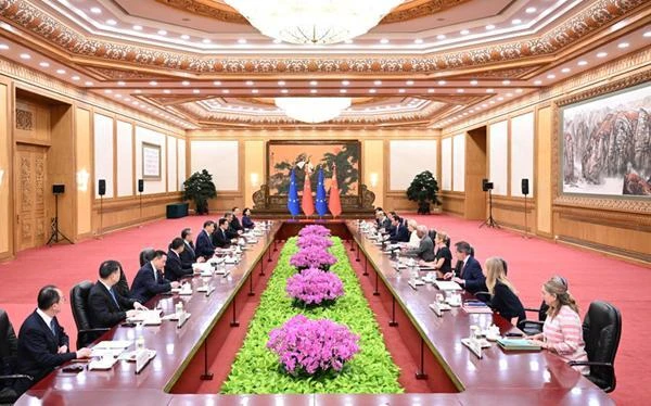 7月24日上午,國(guó)家主席習(xí)近平在北京人民大會(huì)堂會(huì)見(jiàn)來(lái)華舉行第二十五次中國(guó)-歐盟領(lǐng)導(dǎo)人會(huì)晤的歐洲理事會(huì)主席科斯塔和歐盟委員會(huì)主席馮德萊恩。